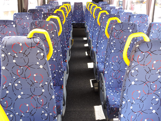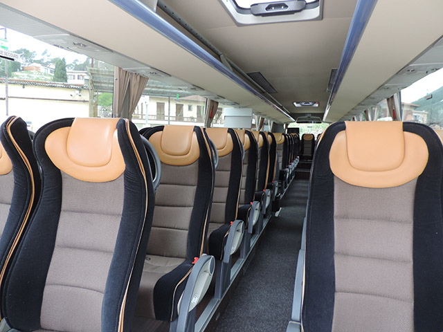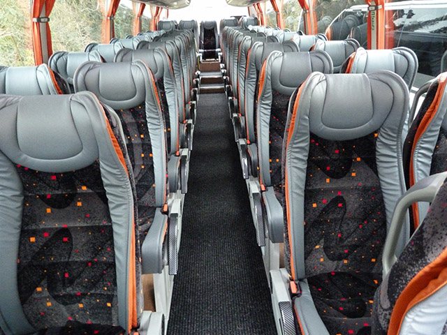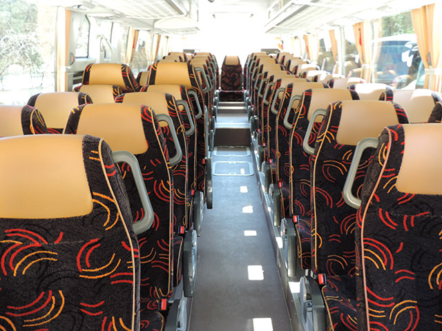 Sièges « confort » et inclinables, ceintures de sécurité, repose pieds, tablettes, lecteur DVD et USB, Micro, Climatisation
